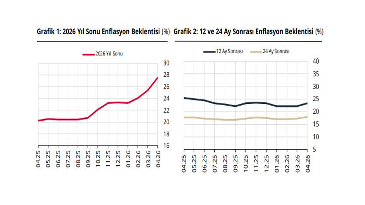 TCMB, Nisan 2026 dönemine ilişkin Piyasa Katılımcıları Anketi verilerini açıkladı. Buna göre; katılımcıların cari yıl sonu tüketici enflasyonu beklentisi bir önceki anket döneminde yüzde 25,38 iken, bu anket döneminde yüzde 27,53 oldu. 12 ay sonrası TÜFE beklentisi bir önceki anket döneminde yüzde 22,17 iken, bu anket döneminde yüzde 23,39 oldu. 24 ay sonrası TÜFE beklentisi ise bir önceki anket döneminde yüzde 17,30 iken, bu anket döneminde yüzde 18,02 olarak gerçekleşti.