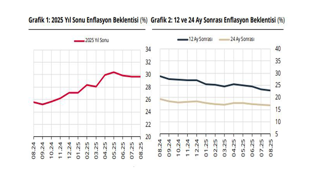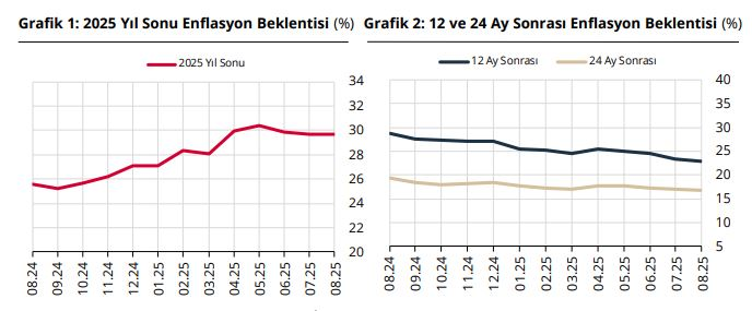 TCMB, Ağustos 2025 dönemine ilişkin piyasa katılımcıları anketi verilerini açıkladı. Buna göre; katılımcıların cari yıl sonu tüketici enflasyonu (TÜFE) beklentisi bir önceki anket döneminde yüzde 29,66 iken, bu anket döneminde yüzde 29,69 oldu. 12 ay sonrası TÜFE beklentisi bir önceki anket döneminde yüzde 23,39 iken, bu anket döneminde yüzde 22,84 oldu. 24 ay sonrası TÜFE beklentisi bir önceki anket döneminde yüzde 17,08 iken, bu anket döneminde yüzde 16,92 olarak gerçekleşti.