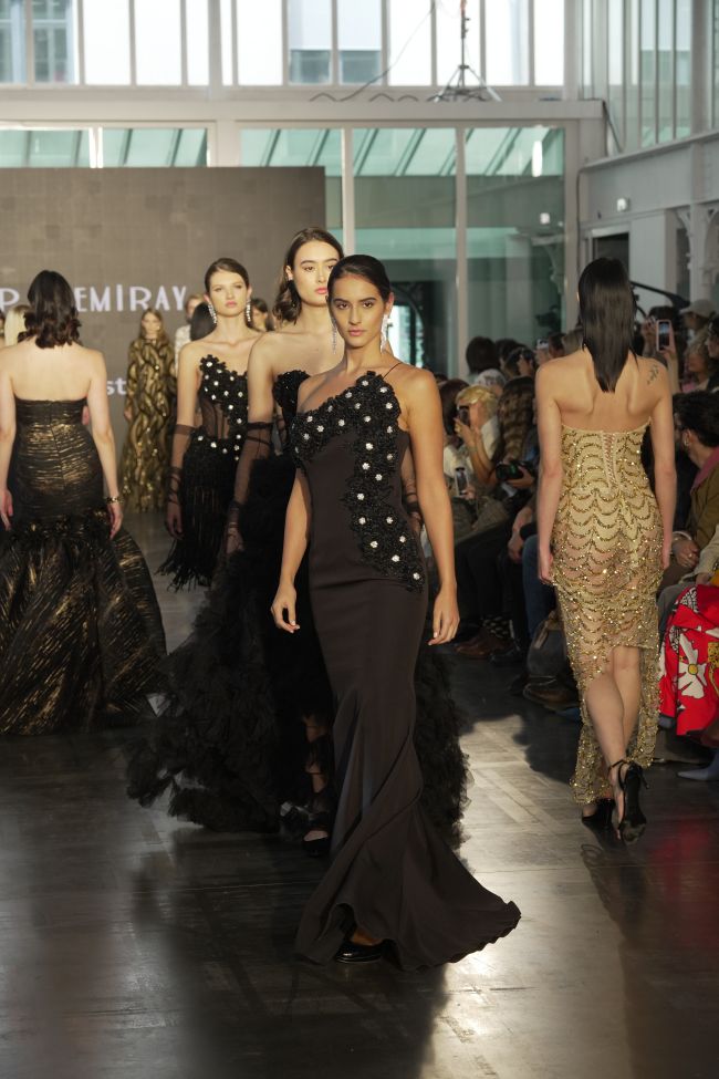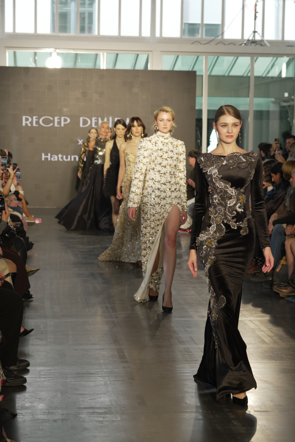 “Zamanın Ötesinde” isimli koleksiyonda, taş işlemeli transparan kumaşlar, sarı ve siyahın uyumuyla şekillenen haute couture tasarımlar büyük alkış aldı.