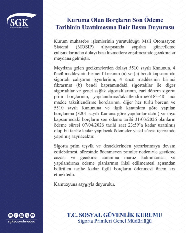 SGK tarafından yapılan yazılı açıklamada, “Kurum muhasebe işlemlerinin yürütüldüğü Mali Otomasyon Sistemi (MOSIP) altyapısında yapılan güncelleme çalışmalarından dolayı bazı hizmetlere erişilmesinde gecikmeler meydana gelmiştir. Meydana gelen gecikmelerden dolayı 5510 sayılı Kanunun, 4 üncü maddesinin birinci fıkrasının (a) ve (c) bendi kapsamında sigortalı çalıştıran işyerlerinin, 4 üncü maddesinin birinci fikrasının (b) bendi kapsamındaki sigortalılar ile diğer sigortalılar ve genel sağlık sigortalılarının, cari dönem sigorta prim borçlarının, yapılandırma/taksitlendirme/6183-48 inci madde taksitlendirme borçlarının, diğer her türlü borcun ve 5510 sayılı Kanununa ve ilgili kanunlara göre yapılan borçlanma (3201 sayılı Kanuna göre yapılanlar dahil) ve ihya kapsamındaki borçların son ödeme tarihi 31/03/2026 olanların ödeme süresi 07/04/2026 tarihi saat 23:59'a kadar uzatılmış olup bu tarihe kadar yapılacak ödemeler yasal süresi içerisinde yapılmış sayılacaktır. Sigorta prim teşvik ve desteklerinden yararlanmaya devam edilebilmesi, süresinde ödenmeyen primler nedeniyle gecikme cezası ve gecikme zammına maruz kalınmaması ve yapılandırma ödeme planlarının ihlal edilmemesi açısından belirtilen tarihe kadar ilgili borçların ödenmesi önem arz etmektedir” denildi.