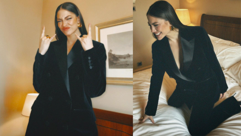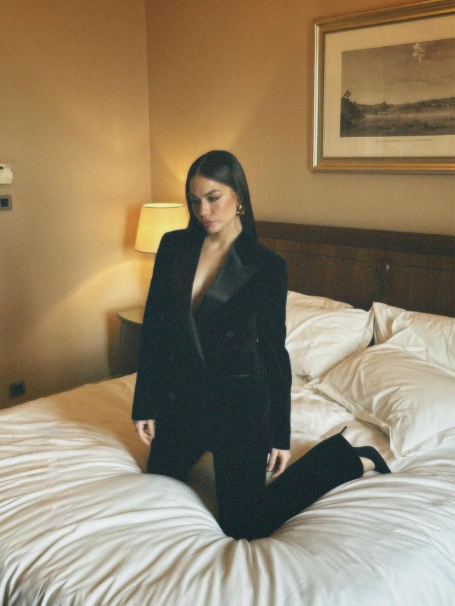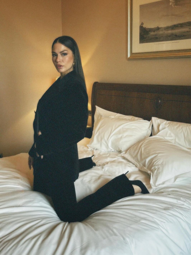 Eşref Rüya dizisinde Nisan karakterine hayat veren Demet Özdemir, yatağın üzerinde siyah takım elbisesiyle verdiği pozlarla dikkatleri üzerine çekti.