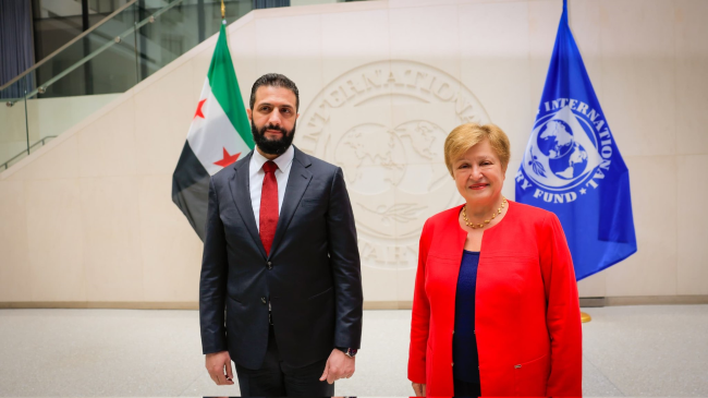 Şara, Suriye Dışişleri Bakanı Esad Hasan Şeybani ile birlikte IMF Başkanı Kristalina Georgieva ile görüştü. Görüşmede, Suriye ile IMF arasında ülkenin kalkınma ve ekonomik gelişim çabalarını desteklemeye yönelik olası iş birliği alanlarının ele alındığı bildirildi.