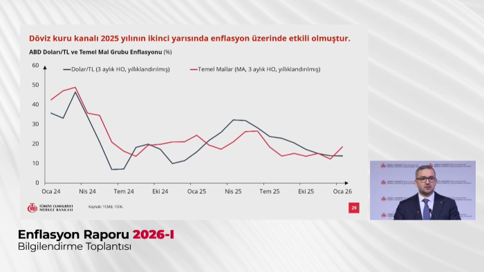 Yılın ilk 'Enflasyon Raporu Bilgilendirme Toplantısı' TCMB Başkanı Fatih Karahan başkanlığında İstanbul Finans Merkezi'nde bulunan Türkiye Cumhuriyet Merkez Bankası yerleşkesinde gerçekleştirildi. TCMB Başkanı Fatih Karahan toplantıda 2026-2028 dönemine ilişkin enflasyon tahminleri ve ara hedefleri, gıda enflasyonunda hava koşullarına bağlı oynaklık ve sebze fiyatları, hizmet enflasyonunda kira ve eğitim kalemleri, kira enflasyonu beklentileri ve enflasyon beklentilerindeki görünüme ilişkin değerlendirmelerde bulundu.