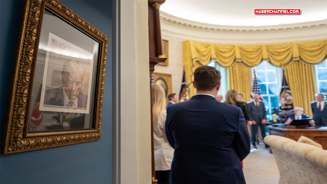 ABD Başkanı Donald Trump'ın sabıka fotoğrafı Oval Ofis'in girişine asıldı.