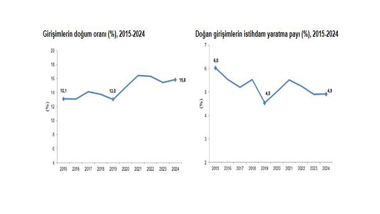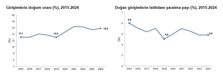 Türkiye İstatistik Kurumu (TÜİK) tarafından yayımlanan 2024 yılına ilişkin girişimcilik ve iş demografisi istatistiklerine göre; girişimlerin 2024 yılında doğum oranı 15,8 oldu. Bu girişimlerin istihdam yaratma payı da yüzde 4,9 olarak kayıtlara geçti.