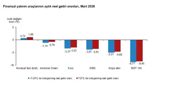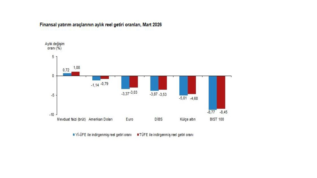 TÜİK, Mart 2026 dönemine ilişkin finansal yatırım araçlarının reel getiri oranlarını açıkladı. Buna göre; aylık en yüksek reel getiri, yurt içi üretici fiyat endeksi (Yİ-ÜFE) ile indirgendiğinde yüzde 0,72, tüketici fiyat endeksi (TÜFE) ile indirgendiğinde ise yüzde 1,08 oranlarıyla mevduat faizinde (brüt) gerçekleşti. Yİ-ÜFE ile indirgendiğinde; yatırım araçlarından, dolar yüzde 1,14, avro yüzde 3,37, devlet iç borçlanma senetleri (DİBS) yüzde 3,87, külçe altın yüzde 5,01 ve BIST 100 endeksi yüzde 8,77 oranlarında yatırımcısına kaybettirdi. TÜFE ile indirgendiğinde ise doları yüzde 0,79, avro yüzde 3,03, DİBS yüzde 3,53, külçe altın yüzde 4,68 ve BIST 100 endeksi yüzde 8,45 oranlarında yatırımcısına kaybettirdi.