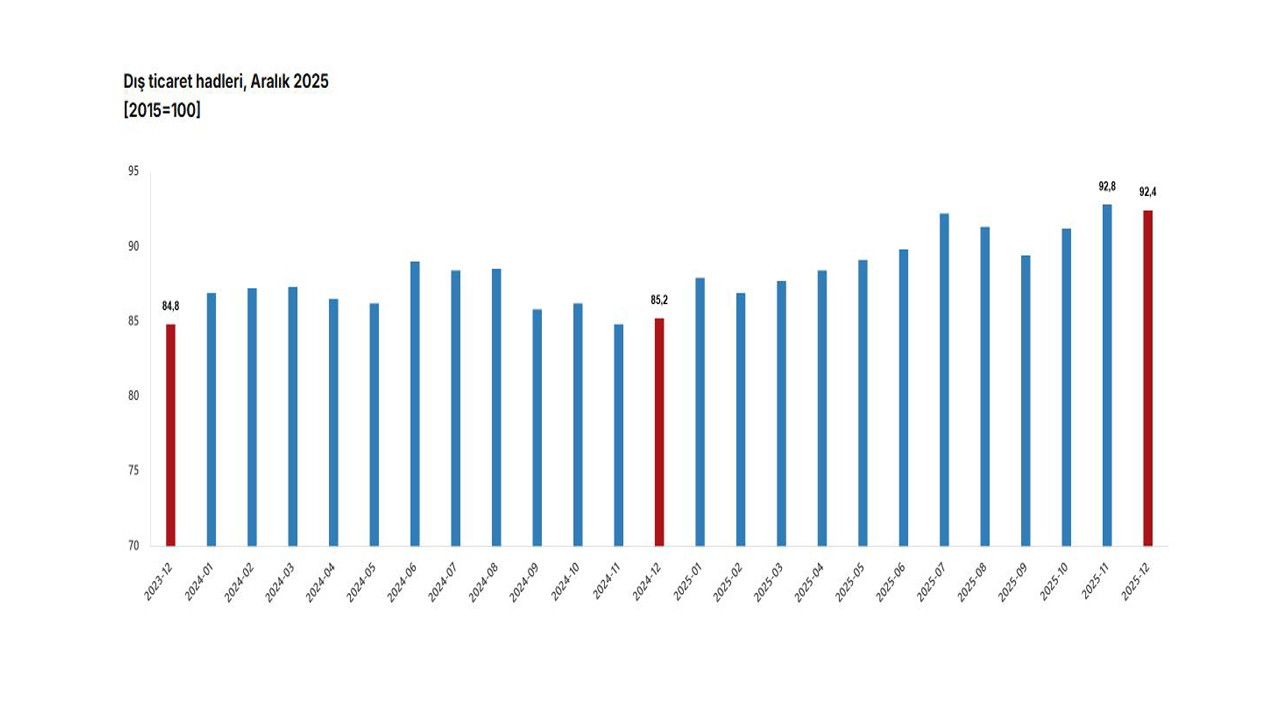 Türkiye İstatistik Kurumu (TÜİK), aralık ayında dış ticaret haddinin bir önceki yılın aynı ayına göre 7,2 puan artarak 92,4 olduğunu açıkladı.