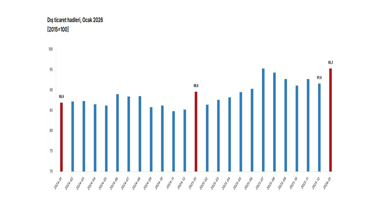 Türkiye İstatistik Kurumu (TÜİK), ocak ayında dış ticaret haddinin bir önceki yılın aynı ayına göre 5,7 puan artarak 95,3 olduğunu açıkladı.