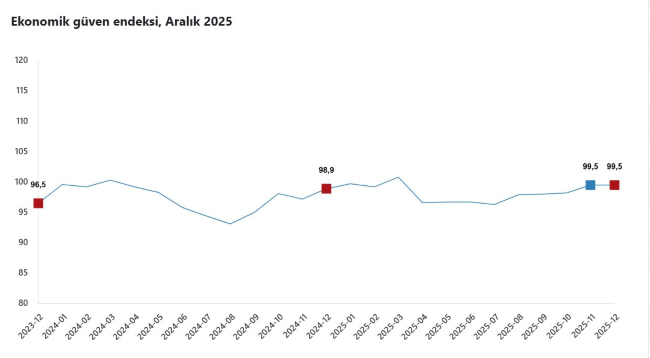 Türkiye İstatistik Kurumu (TÜİK), ekonomik güven endeksinin aralık ayında aynı düzeyde kalarak 99,5 değerini aldığını açıkladı.