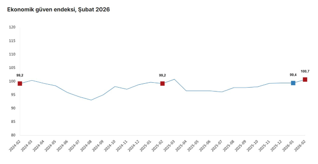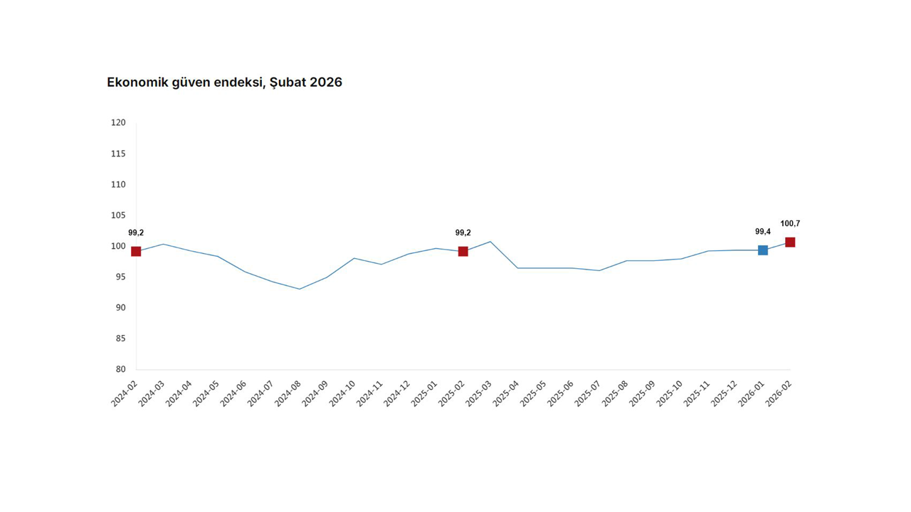 TÜİK, Şubat 2026 dönemine ilişkin ekonomik güven endeksi verilerini açıkladı. Buna göre; ekonomik güven endeksi ocak ayında 99,4 iken, şubat ayında yüzde 1,4 oranında artarak 100,7 değerini aldı.