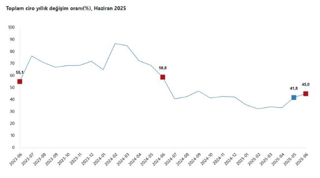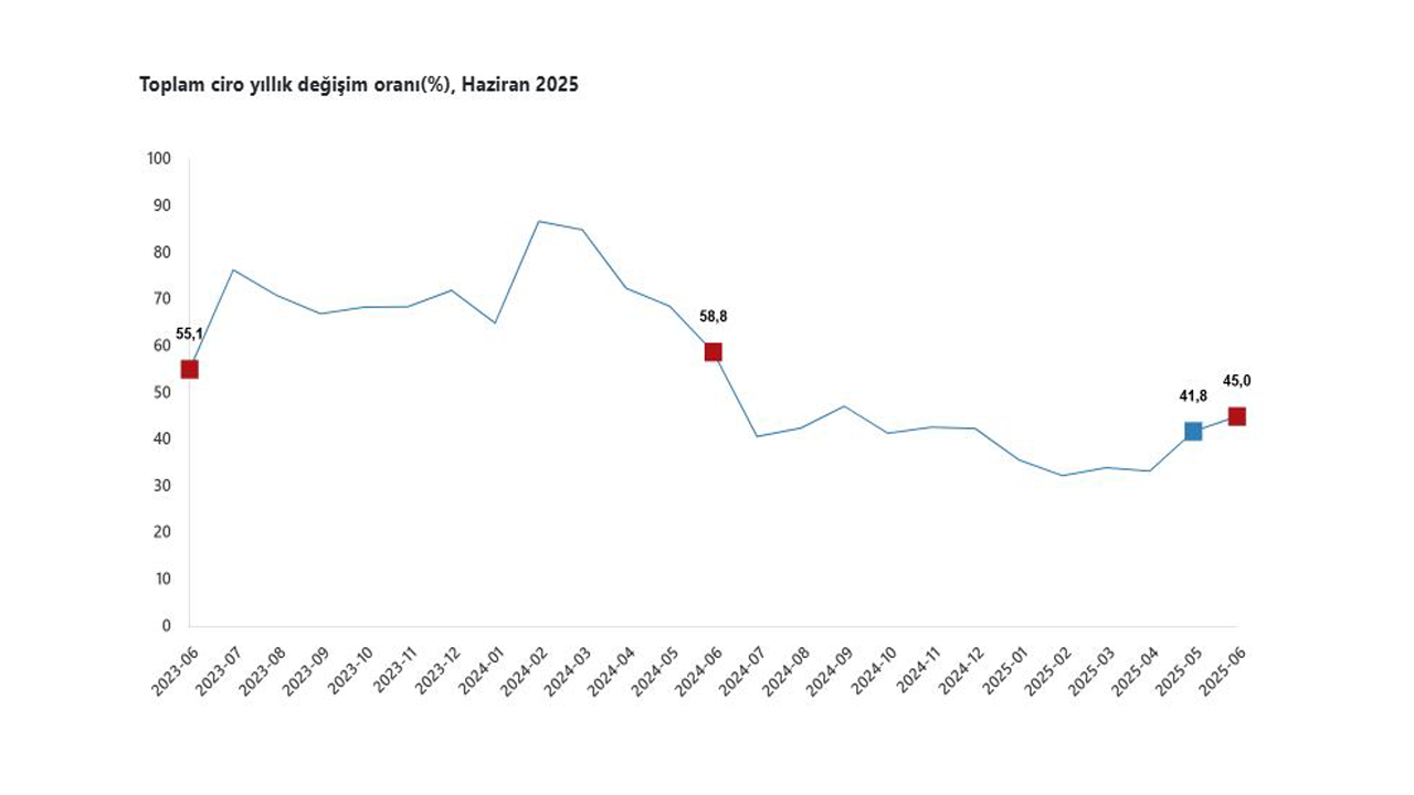 TÜİK, Haziran 2025 döneminde ilişkin ciro endeksleri ile ticaret satış hacim endekslerini açıkladı. Buna göre; sanayi, inşaat, ticaret ve hizmet sektörleri toplamında ciro endeksi haziran ayında bir önceki yılın aynı aynına göre yüzde 45 arttı. Toplam cironun alt detaylarına bakıldığında yıllık sanayi sektörü ciro endeksi yüzde 34,3 arttı, inşaat ciro endeksi yüzde 32,6 arttı, ticaret ciro endeksi yüzde 53 arttı, hizmet ciro endeksi yüzde 41,1 arttı. Sanayi, inşaat, ticaret ve hizmet sektörleri toplamında ciro endeksi bir önceki aya göre yüzde 3,6 arttı. Toplam cironun alt detaylarına bakıldığında aylık sanayi sektörü ciro endeksi yüzde 3,3 arttı, inşaat ciro endeksi yüzde 6,6 azaldı, ticaret ciro endeksi yüzde 5,7 arttı, hizmet ciro endeksi yüzde 1,1 arttı.