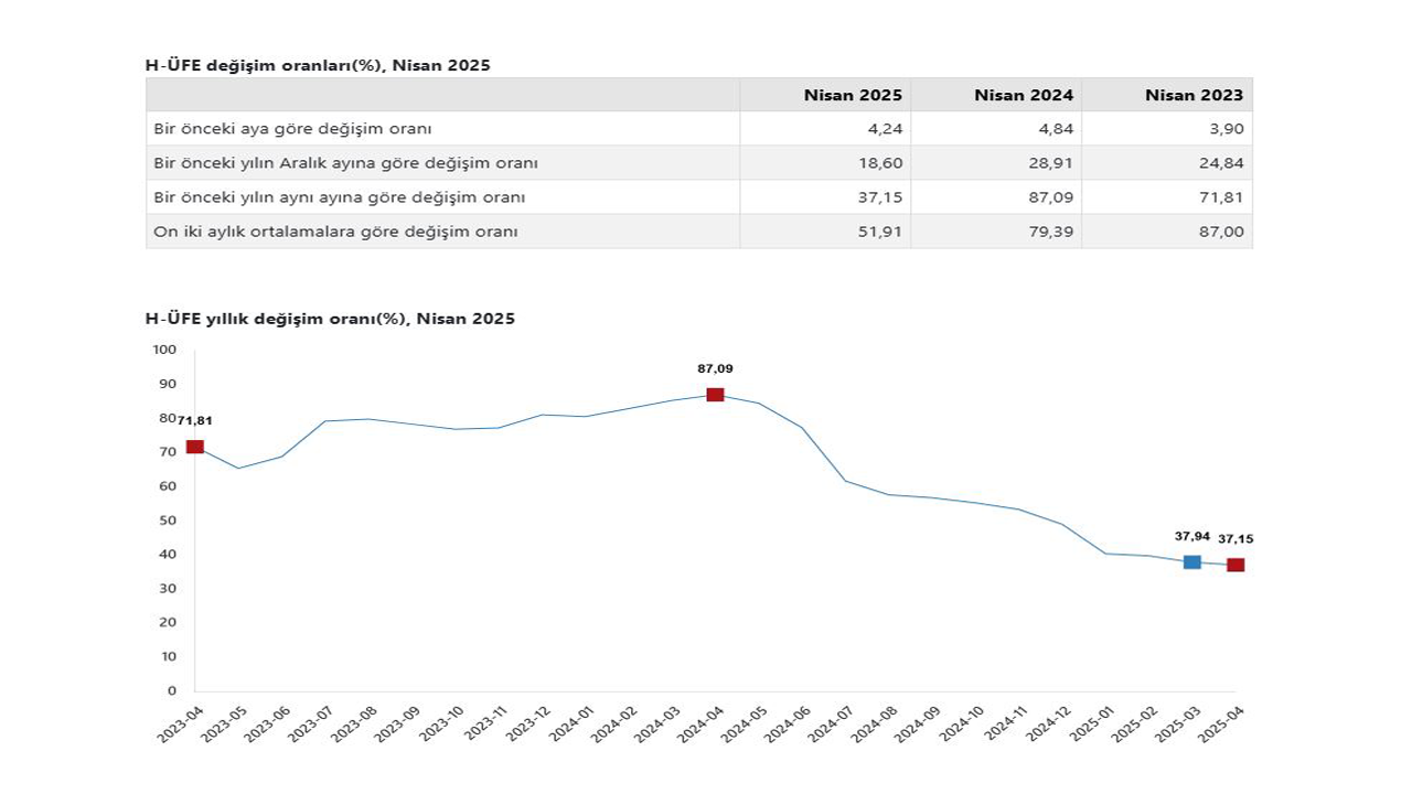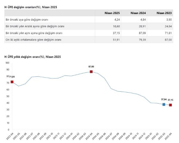 TÜİK, Nisan 2025 dönemine ilişkin hizmet üretici fiyat endeksi verilerini açıkladı. Buna göre; hizmet üretici fiyatları, bir önceki aya göre yüzde 4,24, bir önceki yılın aralık ayına göre yüzde 18,60, bir önceki yılın aynı ayına göre yüzde 37,15 ve 12 aylık ortalamalara göre yüzde 51,91 arttı.