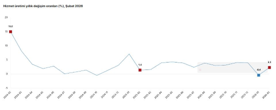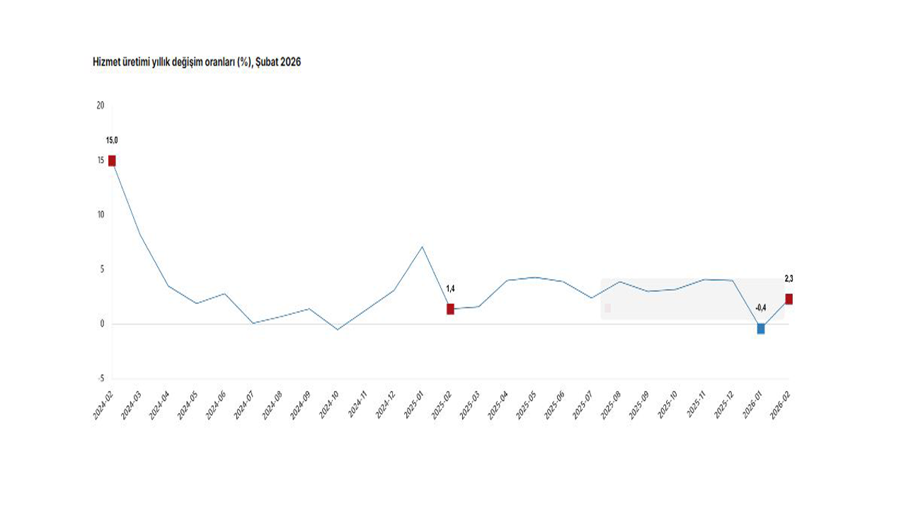 TÜİK, Şubat 2026 dönemine ilişkin hizmet üretim endeksi verilerini açıkladı. Buna göre; hizmet üretimi 2026 yılı Şubat ayında bir önceki yılın aynı ayına göre yüzde 2,3 arttı. Aynı ayda ulaştırma ve depolama hizmetleri yüzde 0,3 azaldı, konaklama ve yiyecek hizmetleri yüzde 3,5 arttı, bilgi ve iletişim hizmetleri yüzde 13,3 arttı, gayrimenkul hizmetleri yüzde 8,7 azaldı, mesleki, bilimsel ve teknik hizmetler yüzde 5,6 arttı, idari ve destek hizmetleri yüzde 1,4 arttı.