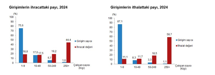 TÜİK, 2024 yılına ilişkin girişim özelliklerine göre dış ticaret istatistiklerini açıkladı. Buna göre; 2024 yılında 179 bin 673 girişim ihracat, 318 bin 603 girişim ithalat yaptı. Toplam ihracatın yüzde 18,8'ini yapan 1-9 kişi çalışanı olan mikro ölçekli girişimler, ihracat yapan tüm girişimlerin yüzde 75,6'sını oluşturdu. İhracatta, 10-49 kişi çalışanı olan küçük ölçekli girişimlerin payı yüzde 17,5, 50-249 kişi çalışanı olan orta ölçekli girişimlerin payı yüzde 19,2, 250+ kişi çalışanı olan büyük ölçekli girişimlerin payı ise yüzde 44,4 oldu. Toplam ithalatın yüzde 11,1'ini 1-9 kişi çalışanı olan mikro ölçekli girişimler yaptı. İthalatta, 10-49 kişi çalışanı olan küçük ölçekli girişimlerin payı yüzde 11,7, 50-249 kişi çalışanı olan orta ölçekli girişimlerin payı yüzde 18,5 oldu. 250+ kişi çalışanı olan büyük ölçekli girişimlerin ithalattaki payı yüzde 58,7 olurken; bu girişimler toplam ithalat yapan girişimlerin yüzde 1,1'ini oluşturdu.