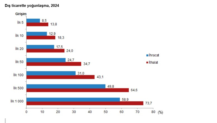 İhracatın yüzde 49,8'ini, ithalatın ise yüzde 64,6'sını ilk 500 girişim yaptı. En çok ihracat yapan ilk 5 girişim toplam ihracatın yüzde 8,5'ini, en çok ithalat yapan ilk 5 girişim ise ithalatın yüzde 13,8'ini gerçekleştirdi. Sanayi sektöründe en fazla ihracat yapan ilk 5 girişimin sanayi sektöründeki payı yüzde 14,4, ticaret sektöründe en fazla ihracat yapan ilk 5 girişimin ticaret sektöründeki payı ise yüzde 11,9 oldu. Sanayi sektöründe en fazla ithalat yapan ilk 5 girişiminin sanayi sektöründeki payı yüzde 19,9, ticaret sektöründe en fazla ithalat yapan ilk 5 girişimin ticaret sektöründeki payı ise yüzde 11,9 oldu.