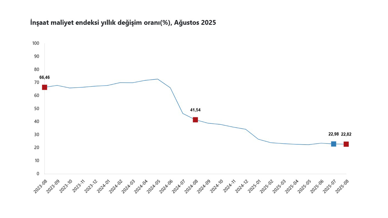Buna göre; inşaat maliyet endeksi, 2025 yılı Ağustos ayında bir önceki aya göre yüzde 1,05, bir önceki yılın aynı ayına göre yüzde 22,82 arttı. Bir önceki aya göre malzeme endeksi yüzde 1,46 arttı, işçilik endeksi yüzde 0,28 arttı. Ayrıca bir önceki yılın aynı ayına göre malzeme endeksi yüzde 19,17 arttı, işçilik endeksi yüzde 30,16 arttı. Bina inşaatı maliyet endeksi, bir önceki aya göre yüzde 1,15, bir önceki yılın aynı ayına göre yüzde 22,53 arttı. Bina dışı yapılar için inşaat maliyet endeksi, bir önceki aya göre yüzde 0,72, bir önceki yılın aynı ayına göre yüzde 23,75 arttı. (DHA)