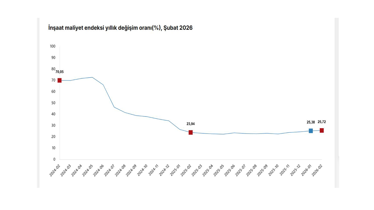 TÜİK, Şubat 2026 dönemine ilişkin inşaat maliyet endeksi verilerini açıkladı. Buna göre; inşaat maliyeti şubat ayında bir önceki aya göre yüzde 1,51, bir önceki yılın aynı ayına göre yüzde 25,72 arttı. Bir önceki aya göre malzeme endeksi yüzde 2,33, işçilik endeksi yüzde 0,20 arttı. Ayrıca bir önceki yılın aynı ayına göre malzeme endeksi yüzde 23,73, işçilik endeksi de yüzde 29,12 arttı. Bina inşaatı maliyet endeksi, bir önceki aya göre yüzde 1,25, bir önceki yılın aynı ayına göre yüzde 25,72 arttı.