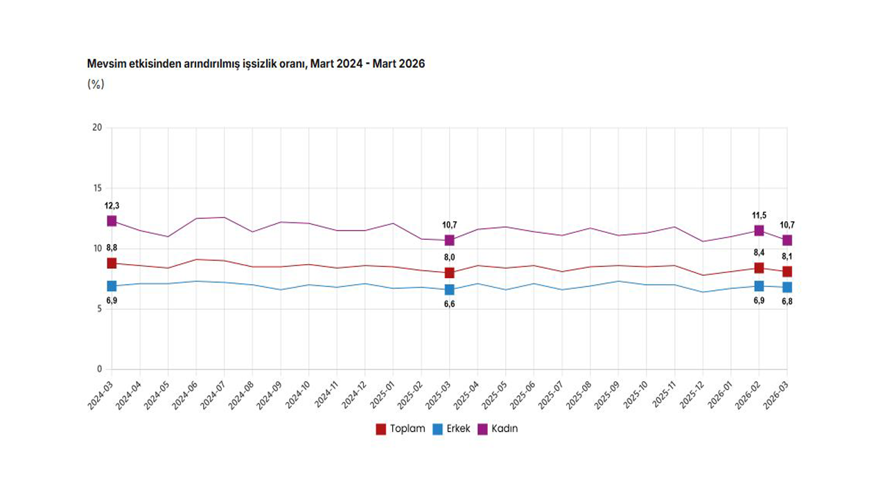 TÜİK, Mart 2026 dönemine ilişkin iş gücü istatistiklerini açıkladı. Buna göre; 15 ve daha yukarı yaştaki kişilerde işsiz sayısı 2026 yılı Mart ayında bir önceki aya göre 96 bin kişi azalarak 2 milyon 873 bin kişi oldu. İşsizlik oranı ise 0,3 puan azalarak yüzde 8,1 seviyesinde gerçekleşti. İşsizlik oranı erkeklerde yüzde 6,8 iken kadınlarda yüzde 10,7 olarak kaydedildi. İstihdam edilenlerin sayısı 2026 yılı Mart ayında bir önceki aya göre 226 bin kişi artarak 32 milyon 425 bin kişi, istihdam oranı ise 0,3 puan artarak yüzde 48,5 oldu. Bu oran erkeklerde yüzde 66 iken kadınlarda yüzde 31,5 olarak gerçekleşti. İş gücü, 2026 yılı Mart ayında bir önceki aya göre 129 bin kişi artarak 35 milyon 298 bin kişi, iş gücüne katılma oranı da 0,1 puan artarak yüzde 52,8 olarak gerçekleşti. İş gücüne katılma oranı erkeklerde yüzde 70,8 iken kadınlarda yüzde 35,3 oldu.