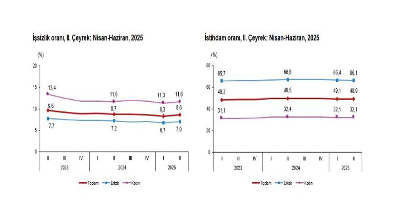 İstihdam edilenlerin sayısı 2025 yılı 2'nci çeyreğinde bir önceki çeyreğe göre 41 bin kişi azalarak 32 milyon 435 bin kişi, istihdam oranı ise 0,2 puanlık azalış ile yüzde 48,9 oldu. Bu oran erkeklerde yüzde 66,1 iken, kadınlarda yüzde 32,1 olarak gerçekleşti. İş gücü, 2025 yılı 2'nci çeyreğinde bir önceki çeyreğe göre 65 bin kişi artarak 35 milyon 469 bin kişi, iş gücüne katılma oranı ise değişim göstermeyerek yüzde 53,5 olarak gerçekleşti. İş gücüne katılma oranı erkeklerde yüzde 71,1, kadınlarda ise yüzde 36,3 oldu.