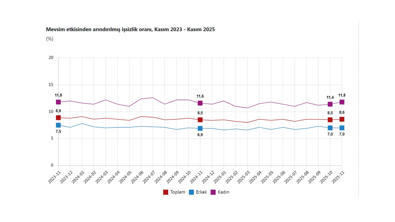 TÜİK, Kasım 2025 dönemine ilişkin iş gücü istatistiklerini açıkladı. Buna göre; 15 ve daha yukarı yaştaki kişilerde işsiz sayısı 2025 yılı Kasım ayında bir önceki aya göre 54 bin kişi artarak 3 milyon 98 bin kişi oldu. İşsizlik oranı 0,1 puan artarak yüzde 8,6 seviyesinde gerçekleşti. İşsizlik oranı erkeklerde yüzde 7 iken, kadınlarda yüzde 11,8 olarak tahmin edildi. İstihdam edilenlerin sayısı 2025 yılı Kasım ayında bir önceki aya göre 75 bin kişi artarak 32 milyon 737 bin kişi, istihdam oranı 0,1 puan artarak yüzde 49,2 oldu. Bu oran erkeklerde yüzde 66,8 iken, kadınlarda yüzde 31,9 olarak gerçekleşti. İşgücü, 2025 yılı Kasım ayında bir önceki aya göre 128 bin kişi artarak 35 milyon 834 bin kişi, işgücüne katılma oranı ise 0,1 puan artarak yüzde 53,8 olarak gerçekleşti. İşgücüne katılma oranı erkeklerde yüzde 71,8 iken, kadınlarda yüzde 36,2 oldu.