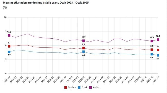 TÜİK, Ocak 2025 dönemine ilişkin iş gücü istatistiklerini açıkladı. Buna göre; 15 ve daha yukarı yaştaki kişilerde işsiz sayısı, bir önceki aya göre 25 bin kişi azalarak 3 milyon 2 bin kişi oldu. İşsizlik oranı 0,1 puan azalarak yüzde 8,4 seviyesinde gerçekleşti. İşsizlik oranı erkeklerde yüzde 6,5 iken, kadınlarda yüzde 12,1 olarak gerçekleşti. İstihdam edilenlerin sayısı, bir önceki aya göre 195 bin kişi azalarak 32 milyon 531 bin kişi, istihdam oranı 0,3 puan azalarak yüzde 49,2 oldu. Bu oran erkeklerde yüzde 66,4 iken, kadınlarda yüzde 32,3 kaydedildi. İstihdam edilenlerin sayısı, bir önceki aya göre 219 bin kişi azalarak 35 milyon 534 bin kişi, iş gücüne katılma oranı 0,4 puan azalarak yüzde 53,7 olarak gerçekleşti. İş gücüne katılma oranı erkeklerde yüzde 71 iken, kadınlarda yüzde 36,7 oldu.