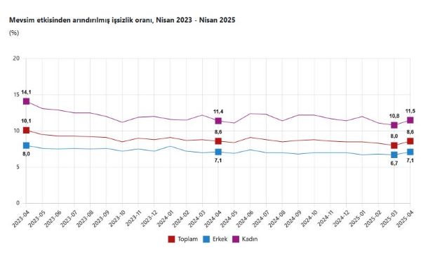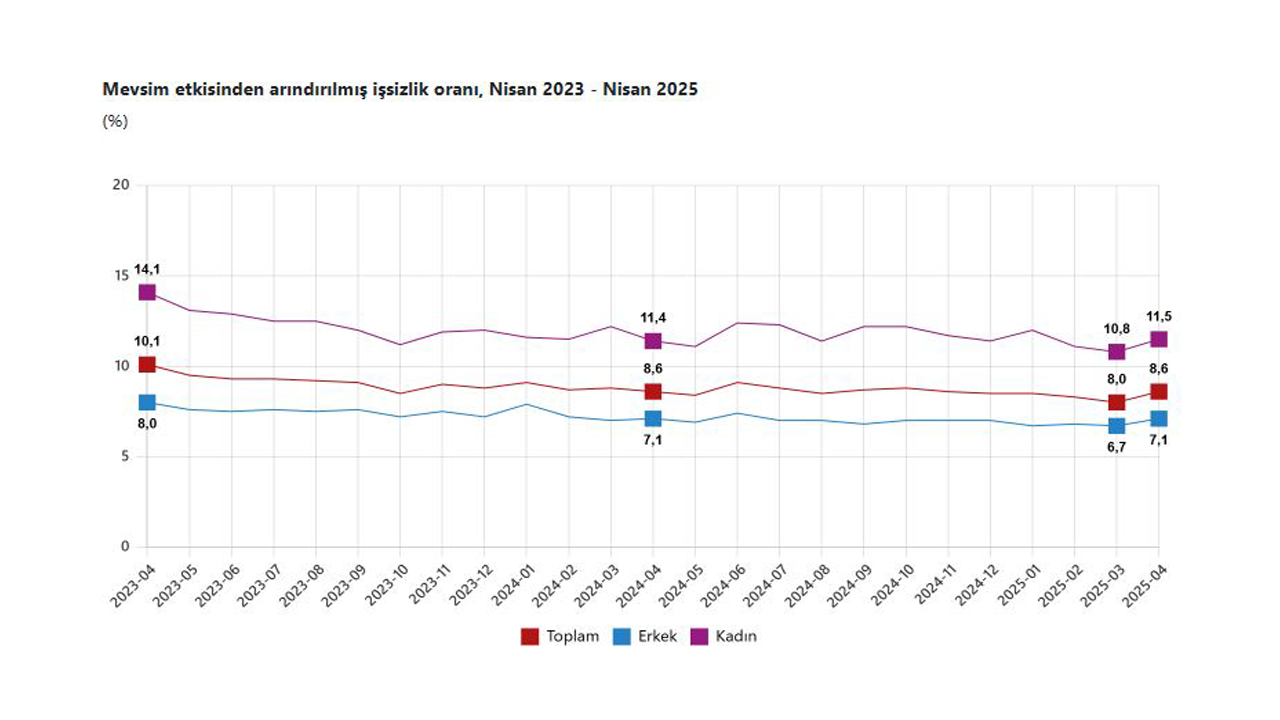 TÜİK, Nisan 2025 dönemine ilişkin iş gücü istatistiklerini açıkladı. Buna göre; 15 ve daha yukarı yaştaki kişilerde işsiz sayısı bir önceki aya göre 203 bin kişi artarak 3 milyon 63 bin kişi oldu. İşsizlik oranı ise 0,6 puan artarak yüzde 8,6 seviyesinde gerçekleşti. İşsizlik oranı erkeklerde yüzde 7,1 iken kadınlarda yüzde 11,5 oldu. İstihdam edilenlerin sayısı, bir önceki aya göre 316 bin kişi azalarak 32 milyon 359 bin kişi, istihdam oranı 0,5 puan azalarak yüzde 48,8 oldu. Bu oran erkeklerde yüzde 65,8 iken kadınlarda yüzde 32,2 olarak gerçekleşti. İş gücü, bir önceki aya göre 114 bin kişi azalarak 35 milyon 421 bin kişi, iş gücüne katılma oranı ise 0,2 puan azalarak yüzde 53,4 olarak gerçekleşti. İş gücüne katılma oranı erkeklerde yüzde 70,9 iken kadınlarda yüzde 36,4 oldu.