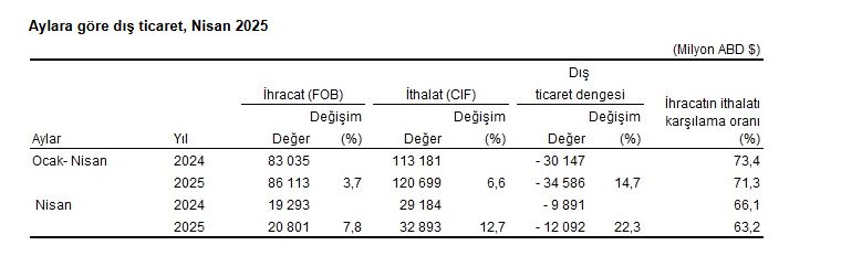 Nisan ayında dış ticaret açığı bir önceki yılın aynı ayına göre yüzde 22,3 artarak 9 milyar 891 milyon dolardan, 12 milyar 92 milyon dolara yükseldi. İhracatın ithalatı karşılama oranı 2024 Nisan ayında yüzde 66,1 iken, 2025 Nisan ayında yüzde 63,2'ye geriledi. Ocak-nisan döneminde dış ticaret açığı yüzde 14,7 artarak 30 milyar 147 milyon dolardan, 34 milyar 586 milyon dolara yükseldi. İhracatın ithalatı karşılama oranı 2024 Ocak-Nisan döneminde yüzde 73,4 iken, 2025 yılının aynı döneminde yüzde 71,3'e geriledi.