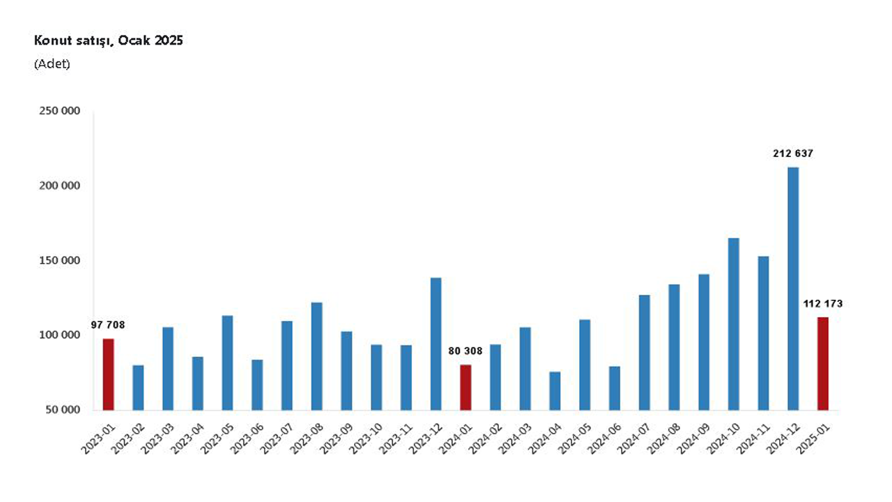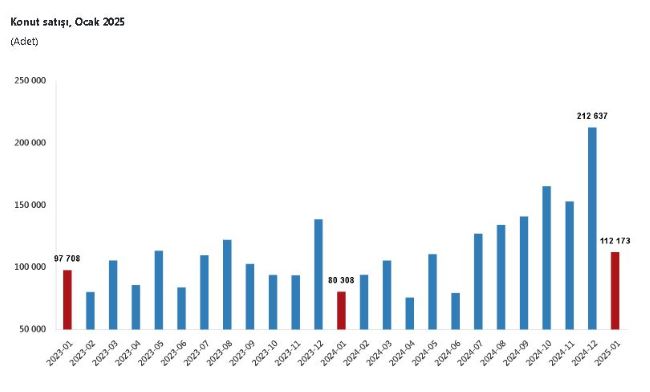 Türkiye İstatistik Kurumu (TÜİK), ocak ayında konut satışlarının bir önceki yıla göre yüzde 39,7 artarak 112 bin 173 olduğunu açıkladı.
