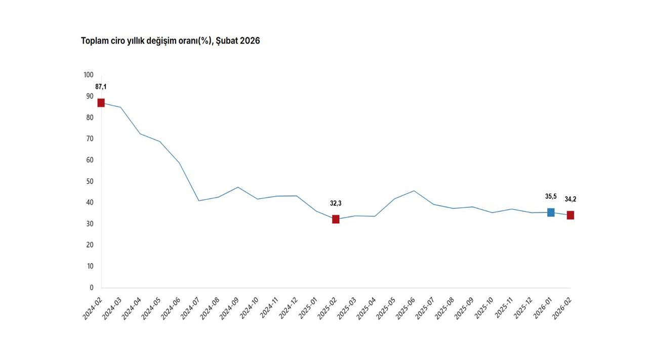 TÜİK, Şubat 2026 dönemine ilişkin ciro ve ticaret satış hacim endeksi verilerini açıkladı. Buna göre; sanayi, inşaat, ticaret ve hizmet sektörleri toplamında ciro endeksi, 2026 yılı Şubat ayında yıllık yüzde 34,2 arttı. Toplam cironun alt detaylarına bakıldığında; 2026 yılı Şubat ayında yıllık sanayi sektörü ciro endeksi yüzde 31,7 arttı, inşaat ciro endeksi yüzde 20,2 arttı, ticaret ciro endeksi yüzde 36,8 arttı, hizmet ciro endeksi yüzde 34,6 arttı.