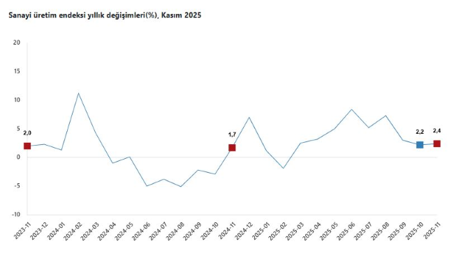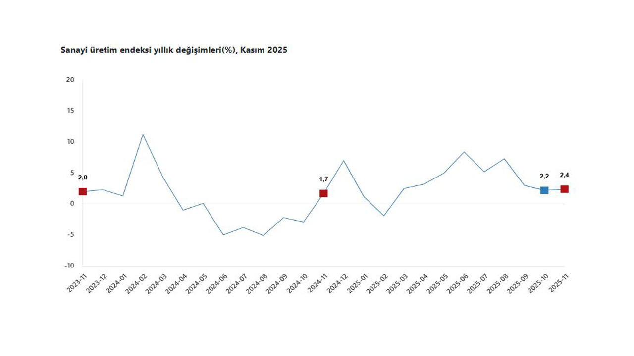 TÜİK, Kasım 2025 dönemine ilişkin sanayi üretim endeksi verilerini açıkladı. Buna göre; sanayi üretimi kasım ayında bir önceki yılın ayı ayına göre yüzde 2,4 arttı. Sanayinin alt sektörleri incelendiğinde, 2025 yılı Kasım ayında madencilik ve taş ocakçılığı sektörü endeksi bir önceki yılın aynı ayına göre yüzde 0,2 arttı, imalat sanayi sektörü endeksi yüzde 2,7 arttı ve elektrik, gaz, buhar ve iklimlendirme üretimi ve dağıtımı sektörü endeksi yüzde 2 azaldı.