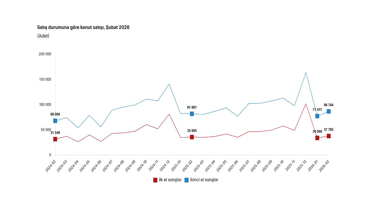 TÜİK, Şubat 2026 dönemine ilişkin konut ve iş yeri satış istatistiklerini açıkladı. Buna göre; Türkiye genelinde ilk el konut satış sayısı şubat ayında bir önceki yılın aynı ayına göre yüzde 5,9 oranında artarak 37 bin 785 oldu. İkinci el konut satışları da şubat ayında bir önceki yılın aynı ayına göre yüzde 6 oranında artarak 86 bin 764 oldu. Toplam konut satışları içinde ilk el konut satışlarının payı yüzde 30,3, ikinci el konut satışlarının payı yüzde 69,7 oldu.