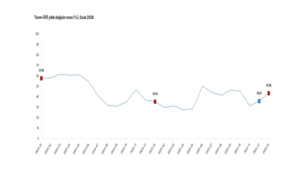 TÜİK, Ocak 2026 dönemine ilişkin tarım ürünleri üretici fiyat endeksi verilerini açıkladı. Buna göre; tarım ürünleri üretici fiyatları ocak ayında bir önceki aya göre yüzde 8,46, bir önceki yılın aynı ayına göre yüzde 43,58 ve 12 aylık ortalamalara göre yüzde 38,18 arttı.