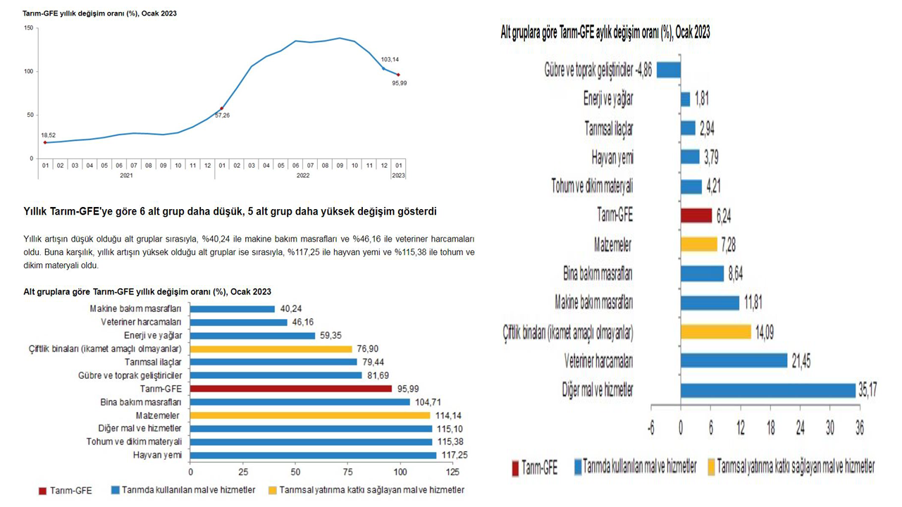 TÜİK, Ocak 2023 dönemine ilişkin tarımsal girdi fiyat endeksi verilerini açıkladı. Buna göre, 2023 Ocak ayında bir önceki aya göre yüzde 6,24, bir önceki yılın aynı ayına göre yüzde 95,99 ve 12 aylık ortalamalara göre yüzde 118,18 artış gerçekleşti. Ana gruplarda bir önceki aya göre, tarımda kullanılan mal ve hizmet endeksinde yüzde 5,77, tarımsal yatırıma katkı sağlayan mal ve hizmet endeksinde yüzde 9,62 artış gerçekleşti. Bir önceki yılın aynı ayına göre, göre tarımda kullanılan mal ve hizmet endeksinde yüzde 95,54, tarımsal yatırıma katkı sağlayan mal ve hizmet endeksinde yüzde 99,13 artış gerçekleşti.