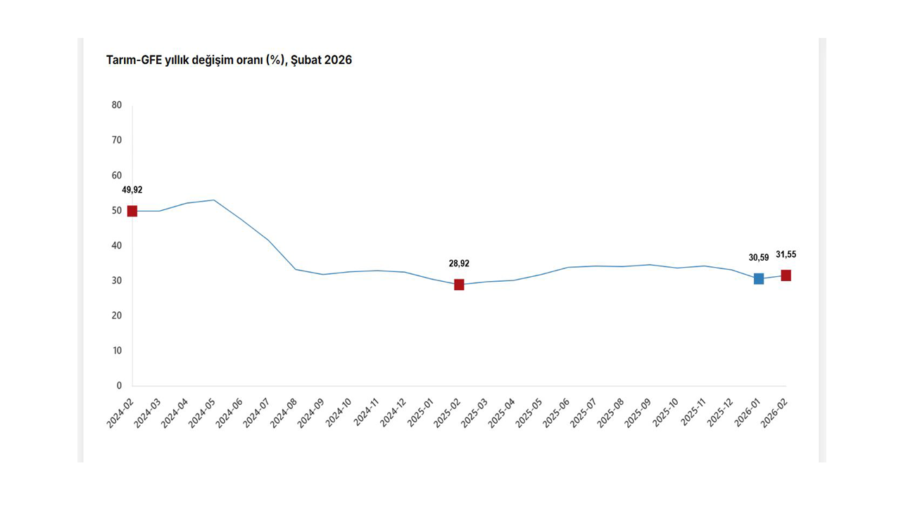 TÜİK, Şubat 2026 dönemine ilişkin tarımsal girdi fiyat endeksi verilerini açıkladı. Buna göre; tarımsal girdi fiyatları 2026 yılı Şubat ayında bir önceki aya göre yüzde 3,10, bir önceki yılın aralık ayına göre yüzde 7,08, bir önceki yılın aynı ayına göre yüzde 31,55 ve 12 aylık ortalamalara göre yüzde 32,64 arttı. Ana gruplarda bir önceki aya göre, tarımda kullanılan mal ve hizmetler endeksinde yüzde 2,96 artış, tarımsal yatırıma katkı sağlayan mal ve hizmetler endeksinde yüzde 3,94 artış gerçekleşti.