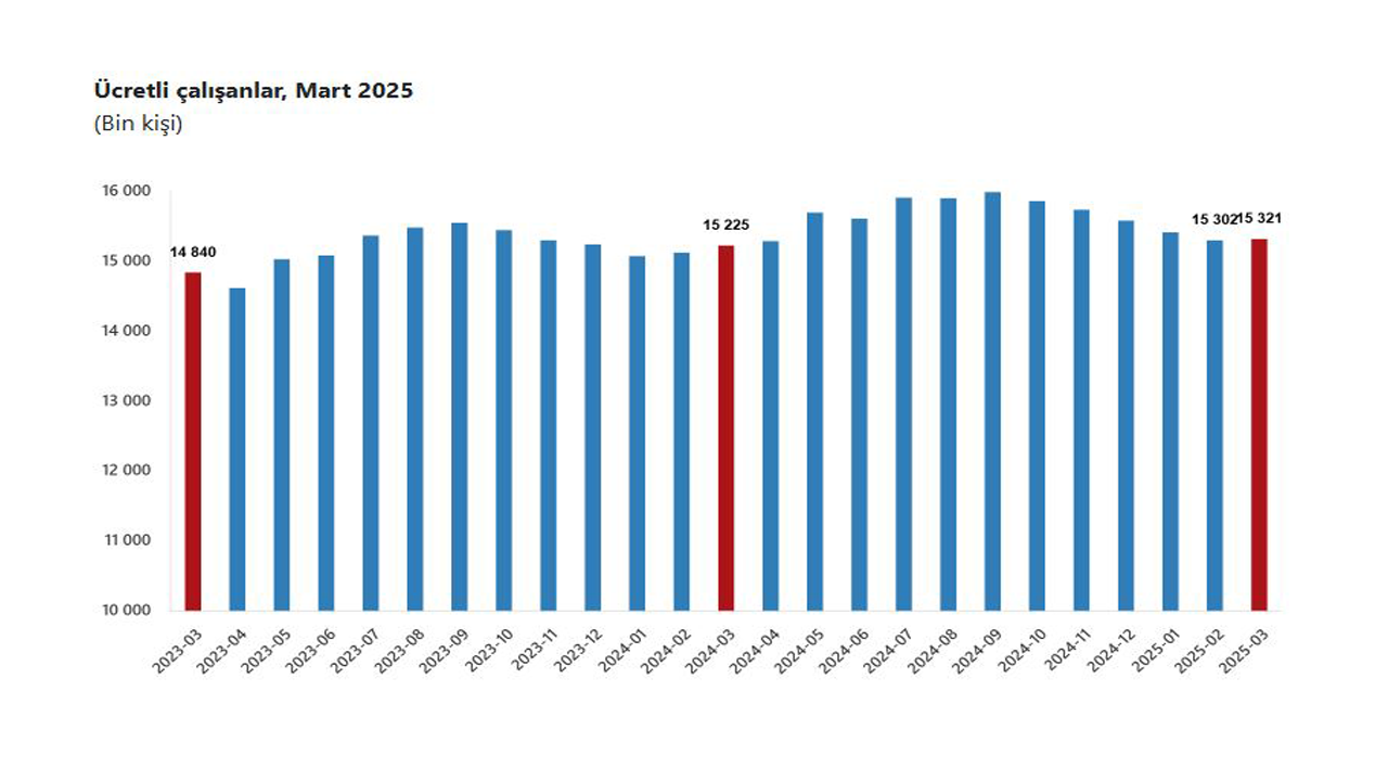 TÜİK, Mart 2025 dönemine ilişkin ücretli çalışan istatistiklerini açıkladı. Buna göre; sanayi, inşaat ve ticaret-hizmet sektörleri toplamında ücretli çalışan sayısı bir önceki yılın aynı ayına göre yüzde 0,6 arttı. Ücretli çalışan sayısı bir önceki yılın aynı ayında 15 milyon 224 bin 973 kişi iken, 2025 yılı Mart ayında 15 milyon 320 bin 987 kişi oldu. Ücretli çalışanların alt detaylarına bakıldığında; 2025 Mart ayında ücretli çalışan sayısı yıllık olarak sanayi sektöründe yüzde 2,6 azaldı, inşaat sektöründe aynı kaldı ve ticaret-hizmet sektöründe yüzde 2,7 arttı.