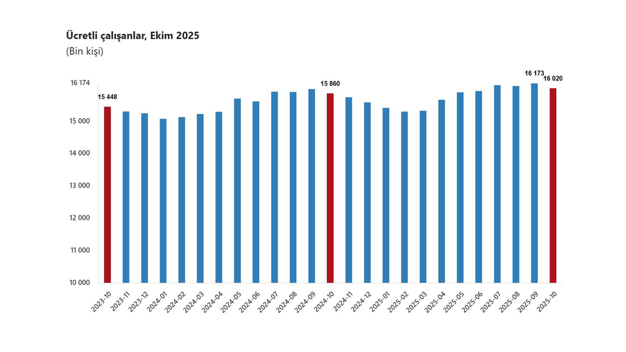 TÜİK, Ekim 2025 dönemine ilişkin ücretli çalışan istatistiklerini açıkladı. Buna göre, sanayi, inşaat ve ticaret-hizmet sektörleri toplamında ücretli çalışan sayısı 2025 Ekim ayında bir önceki yılın aynı ayına göre yüzde 1 arttı. Ücretli çalışan sayısı bir önceki yılın aynı ayında 15 milyon 860 bin 31 kişi iken, 2025 yılı ekim ayında 16 milyon 20 bin 394 kişi oldu. Ücretli çalışanların alt detaylarına bakıldığında, 2025 Ekim ayında ücretli çalışan sayısı yıllık olarak sanayi sektöründe yüzde 3,5 azaldı, inşaat sektöründe yüzde 6,2 arttı ve ticaret-hizmet sektöründe yüzde 2,5 arttı.