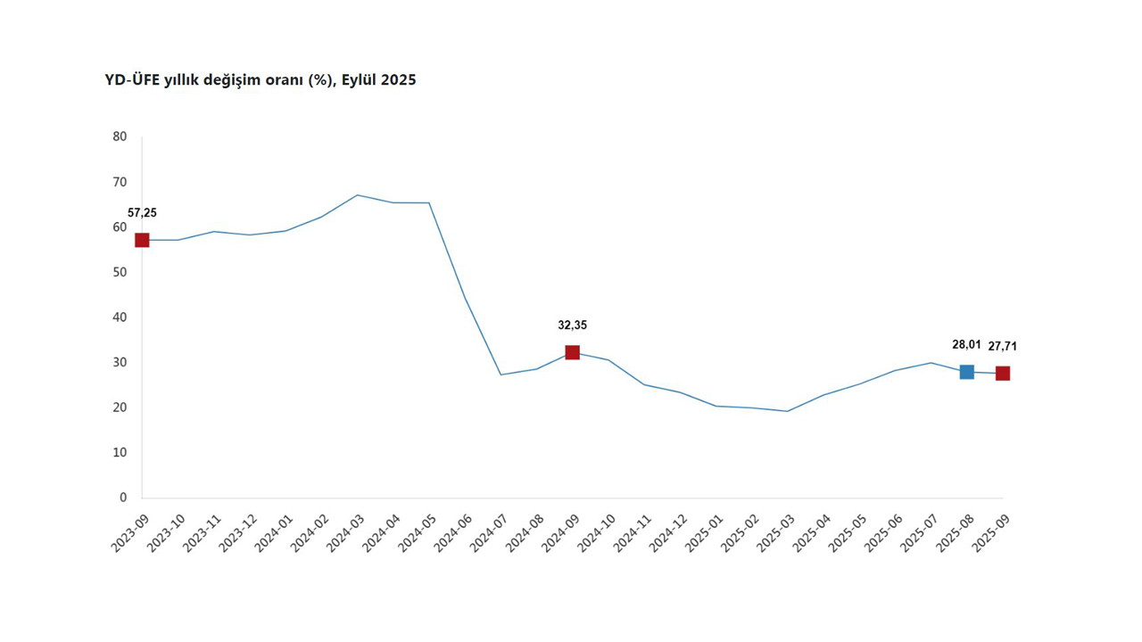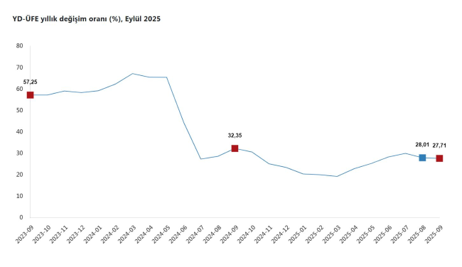 Türkiye İstatistik Kurumu (TÜİK), yurt dışı üretici fiyatlarının eylül ayında yıllık yüzde 27,71, aylık yüzde 2,01 arttığını açıkladı.