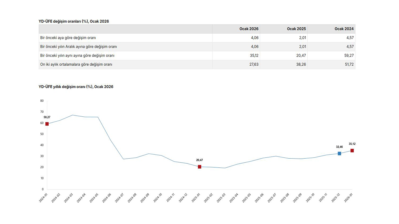 Türkiye İstatistik Kurumu (TÜİK), yurt dışı üretici fiyatlarının ocak ayında yıllık yüzde 35,12; aylık yüzde 4,06 arttığını açıkladı.