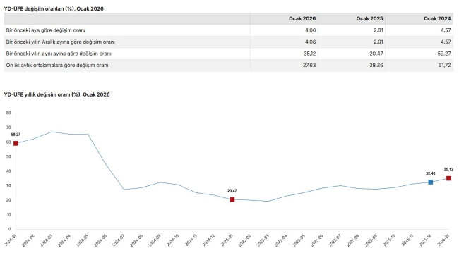 TÜİK, Ocak 2026 dönemine ilişkin yurt dışı üretici fiyat endeksi verilerini açıkladı. Buna göre; yurt dışı üretici fiyatları 2026 yılı Ocak ayında bir önceki aya göre yüzde 4,06, bir önceki yılın aynı ayına göre yüzde 35,12 ve 12 aylık ortalamalara göre yüzde 27,63 arttı. Sanayinin iki sektörünün yıllık değişimleri; madencilik ve taş ocakçılığında yüzde 57 artış, imalatta yüzde 34,76 artış olarak gerçekleşti.