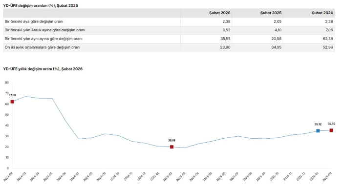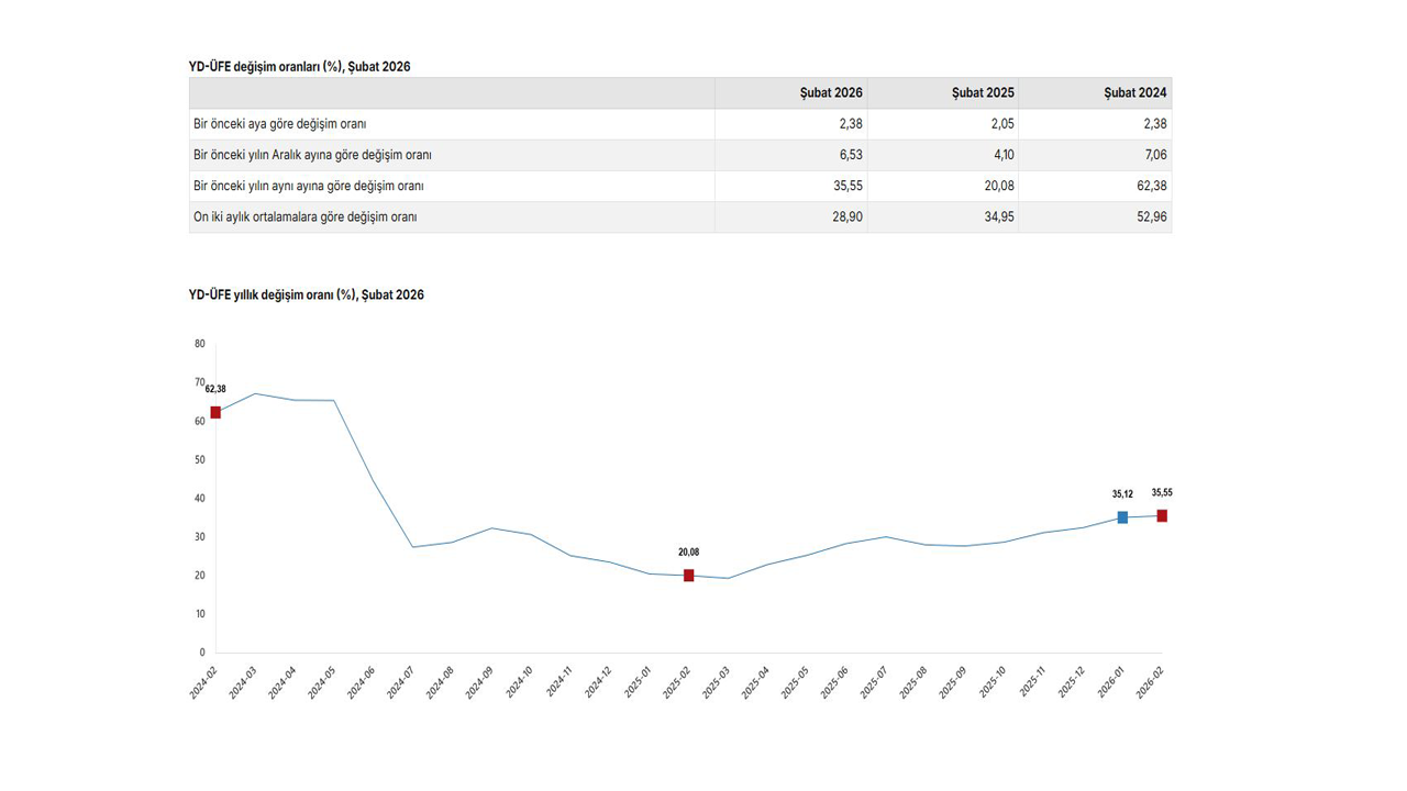 TÜİK, Şubat 2026 dönemine ilişkin yurt dışı üretici fiyat endeksi verilerini açıkladı. Buna göre; yurt dışı üretici fiyatları şubat ayında bir önceki aya göre yüzde 2,38, bir önceki yılın aralık ayına göre yüzde 6,53, bir önceki yılın aynı ayına göre yüzde 35,55 ve 12 aylık ortalamalara göre yüzde 28,90 arttı.