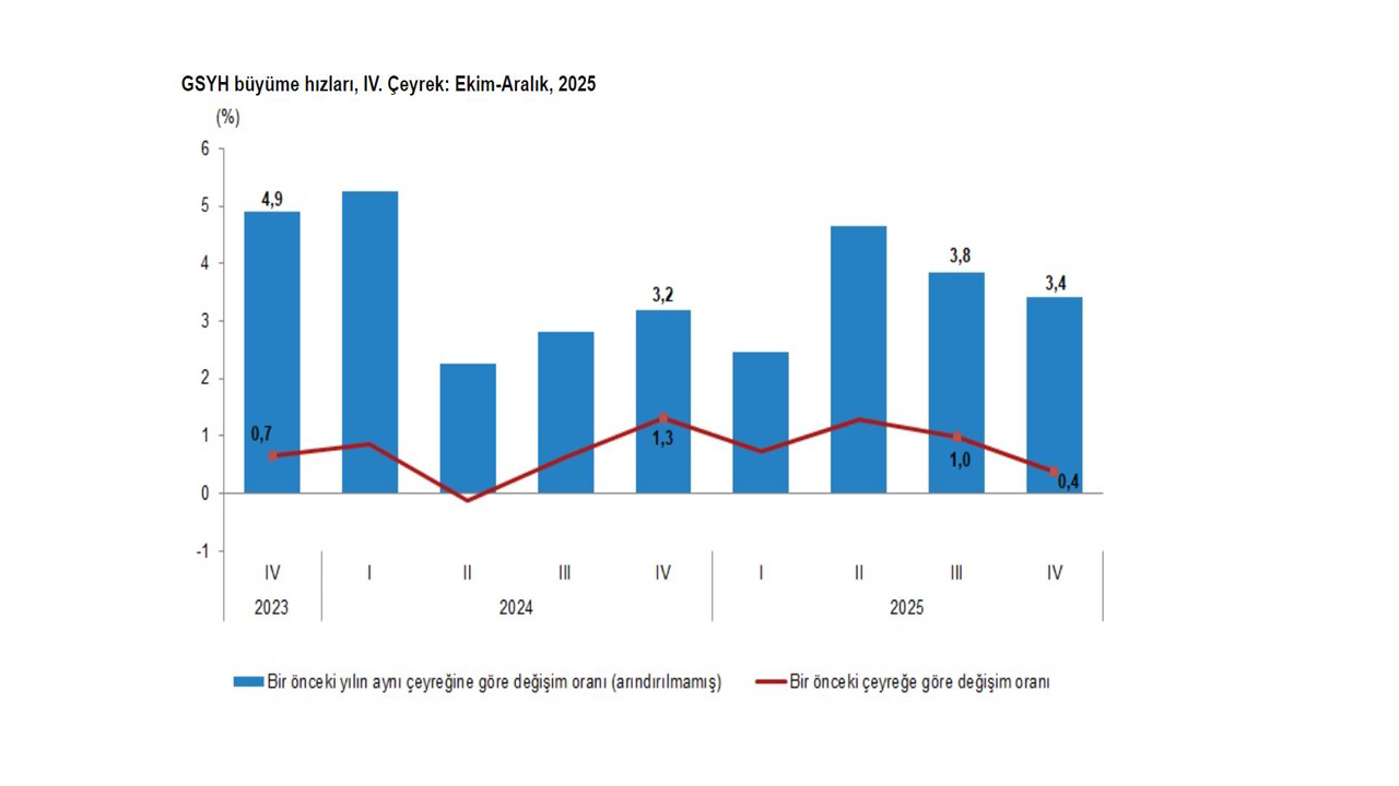 GSYH 2025 yılının 4'üncü çeyrek ilk tahmini; zincirlenmiş hacim endeksi olarak, bir önceki yılın aynı çeyreğine göre yüzde 3,4 arttı. Mevsim ve takvim etkilerinden arındırılmış GSYH zincirlenmiş hacim endeksi, bir önceki çeyreğe göre yüzde 0,4 arttı. Takvim etkisinden arındırılmış GSYH zincirlenmiş hacim endeksi, 2025 yılının 4'üncü çeyreğinde bir önceki yılın aynı çeyreğine göre yüzde 3,4 arttı. Üretim yöntemiyle Gayrisafi Yurt İçi Hasıla tahmini, 2025 yılının 4'üncü çeyreğinde cari fiyatlarla bir önceki yılın aynı çeyreğine göre yüzde 41,4 artarak 18 trilyon 467 milyar 295 milyon TL oldu. GSYH'nin 4'üncü çeyrek değeri cari fiyatlarla dolar bazında 438 milyar 605 milyon olarak gerçekleşti.