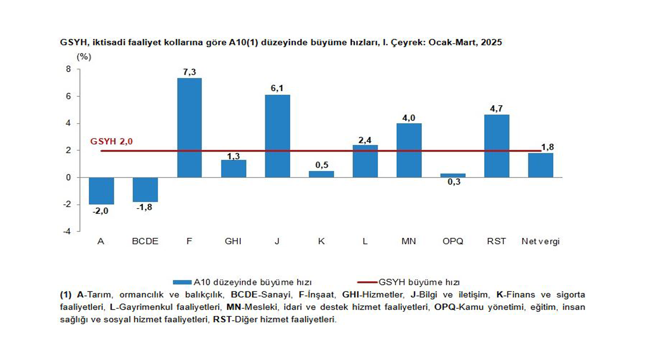 Türkiye İstatistik Kurumu (TÜİK), yılın birinci çeyreğine ilişkin dönemsel gayrisafi yurt içi hasılanın (GSYH) bir önceki yılın aynı çeyreğine göre yüzde 2 arttığını açıkladı. Türkiye ekonomisi, 2025 yılı ilk çeyreğinde yüzde 2 büyüme kaydetmiş oldu.