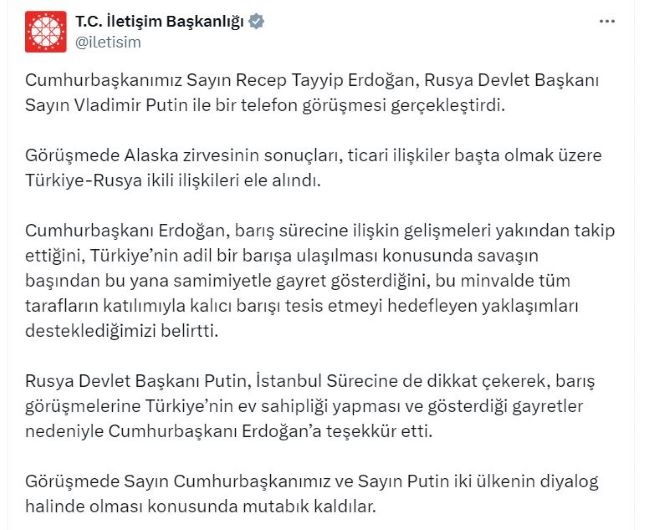 İletişim Başkanlığı'ndan yapılan açıklamaya göre; görüşmede, Alaska zirvesinin sonuçları, ticari ilişkiler başta olmak üzere Türkiye-Rusya ikili ilişkileri ele alındı. Cumhurbaşkanı Erdoğan, barış sürecine ilişkin gelişmeleri yakından takip ettiğini, Türkiye'nin adil bir barışa ulaşılması konusunda savaşın başından bu yana samimiyetle gayret gösterdiğini, bu minvalde tüm tarafların katılımıyla kalıcı barışı tesis etmeyi hedefleyen yaklaşımları desteklediklerini belirtti.