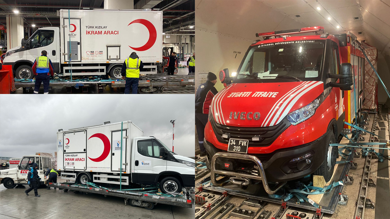 Öte yandan THY Basın Müşavirliği'nin paylaştığı görüntülerde, deprem bölgesinde arama ve kurtarma faaliyetlerine katılacak İstanbul İtfaiyesine ait araçlarıyla, Kızılay'a ait ikram araçlarının İstanbul Havalimanı'nda uçağa yüklenme anlarına ilişkin görüntüler yer aldı.